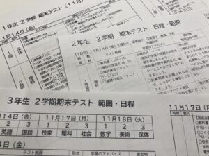 11月の予定表をアップしました。 鶴中のテスト週間は金曜からですがもう範囲発表があった様で、今日も多くの生徒が自習に来てくれました。 週末に実施した提出物サポートのお陰で、大半の子は提出物を終えており、既に教材を反復して […]